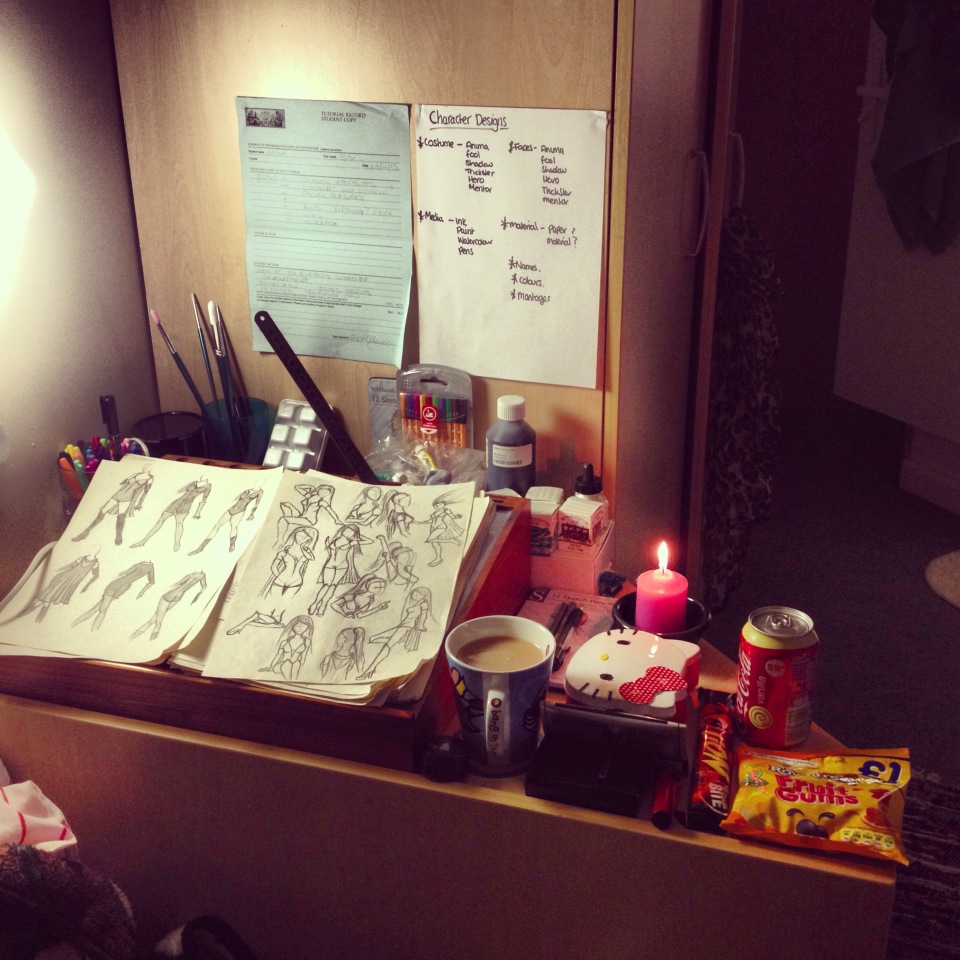 I created a work space in my room so that I could focus on my ideas and see what my next steps were, as well as having everything I may need around me within reach so i don't loose my focus. Having this kind of work space increased my motivation for this project, as I was able to just close the rest of the world off and create. In the future I wish to have my very own studio space to work in.